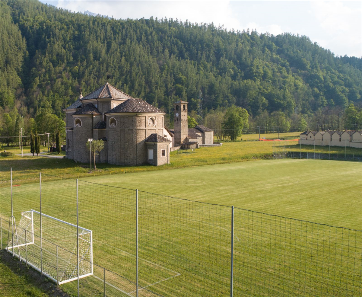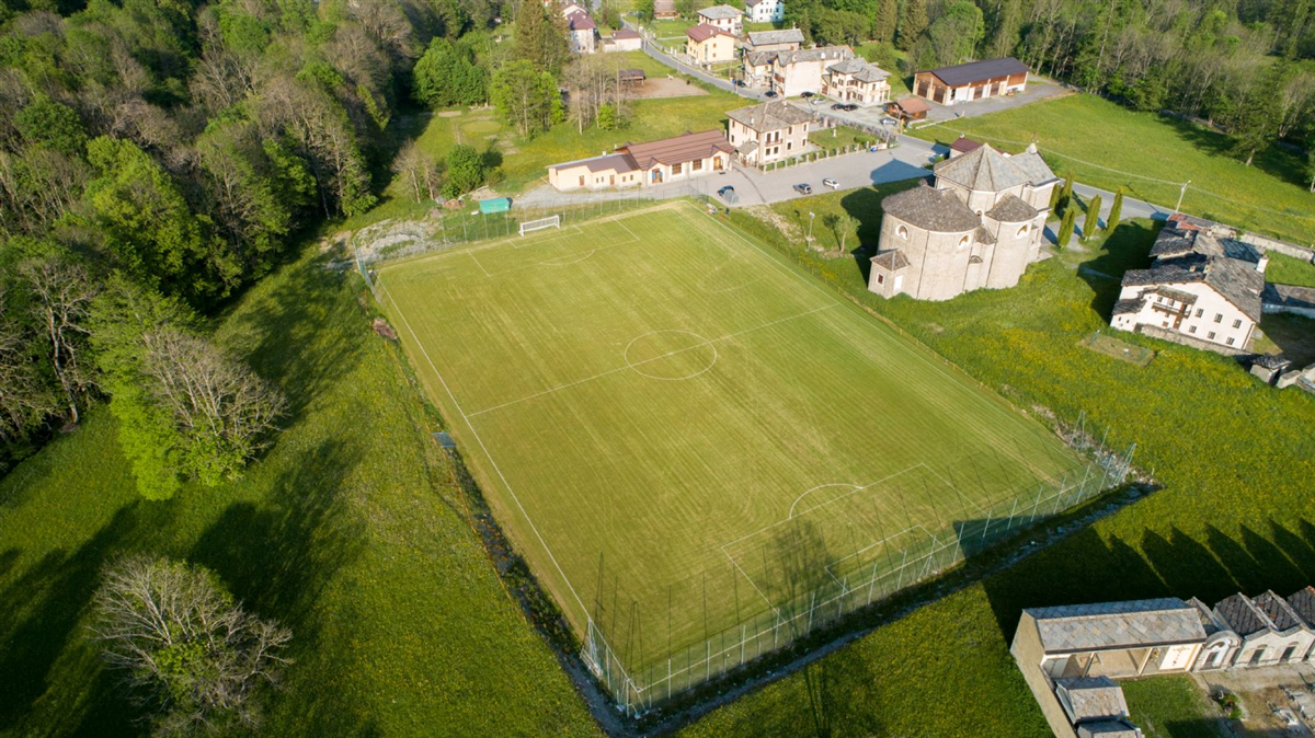 Campo sportivo e parrocchia Ripresa aerea del campo sportivo comunale e dellantico complesso parrocchiale di Usseglio Fotografia di Alberto Varalli